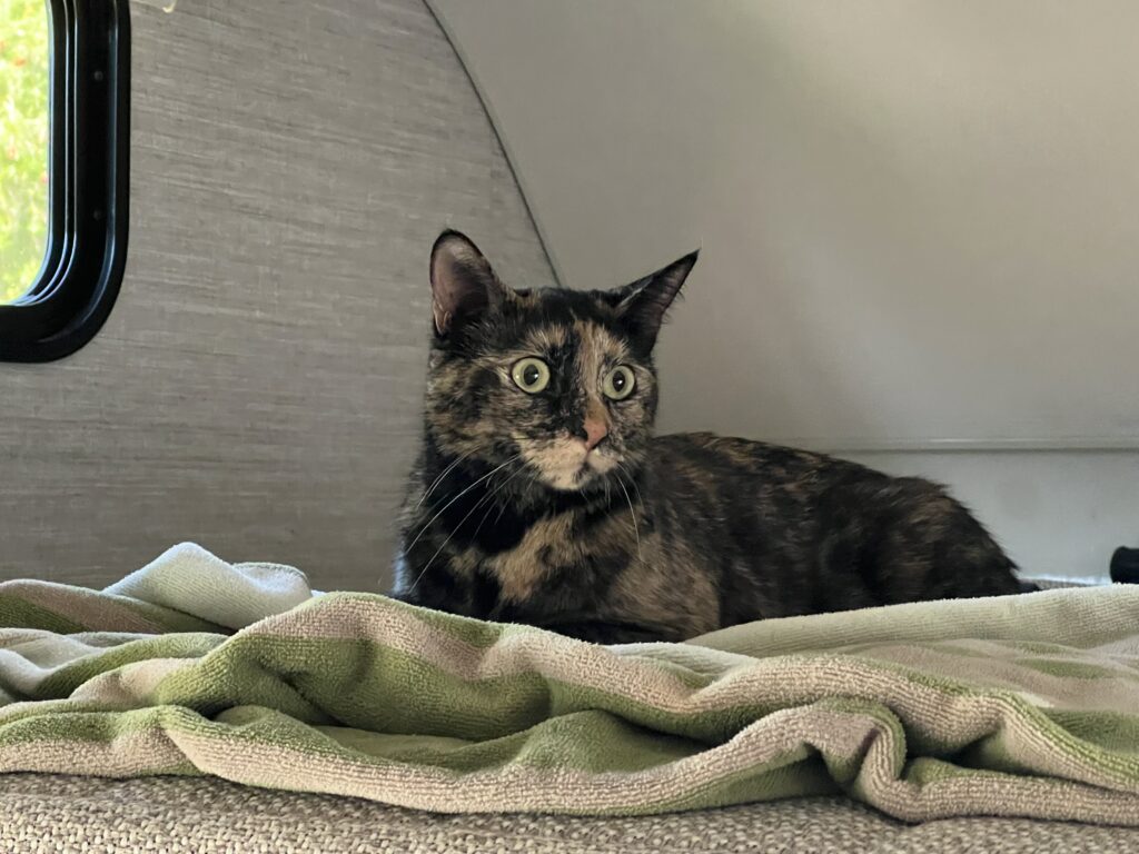 Penny, my cat, is along for the full eight-day ride. She’s already developing her own travel rhythm. Hiding when it’s time to load the RV, curling up quietly once she’s in the bag, and then gradually exploring every nook and cranny once we’re parked.